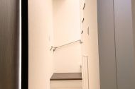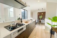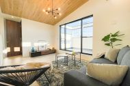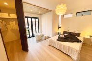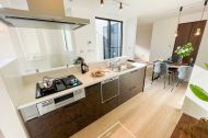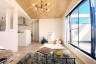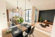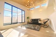 LDKの大きな窓から見える青空。窓を開けると心地よい風が吹き抜けます。キッチンを中央に配置することで食事をするダイニングスペースとリラックスするリビングスペースを区切ることができます。ただ、空間を区切るので狭く感じやすいところを坪庭のように囲われたバルコニーを設置することで目線がリビングへつながり空間を広く感じさせてくれます。また1階の主寝室にはDOMAスペースをプラス。寝るだけの部屋にするのではなく自分時間を有意義に過ごせる空間を提案します。