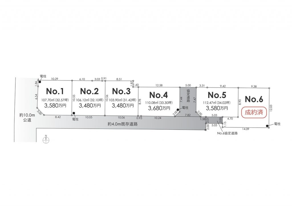土地面積 | No.1:107.70㎡(32.57坪)・No.2:106.12㎡(32.10坪)・No.3:103.90㎡(31.42坪)・No.4:110.08㎡(33.30坪)・No.5:112.47㎡(34.02坪) | ||