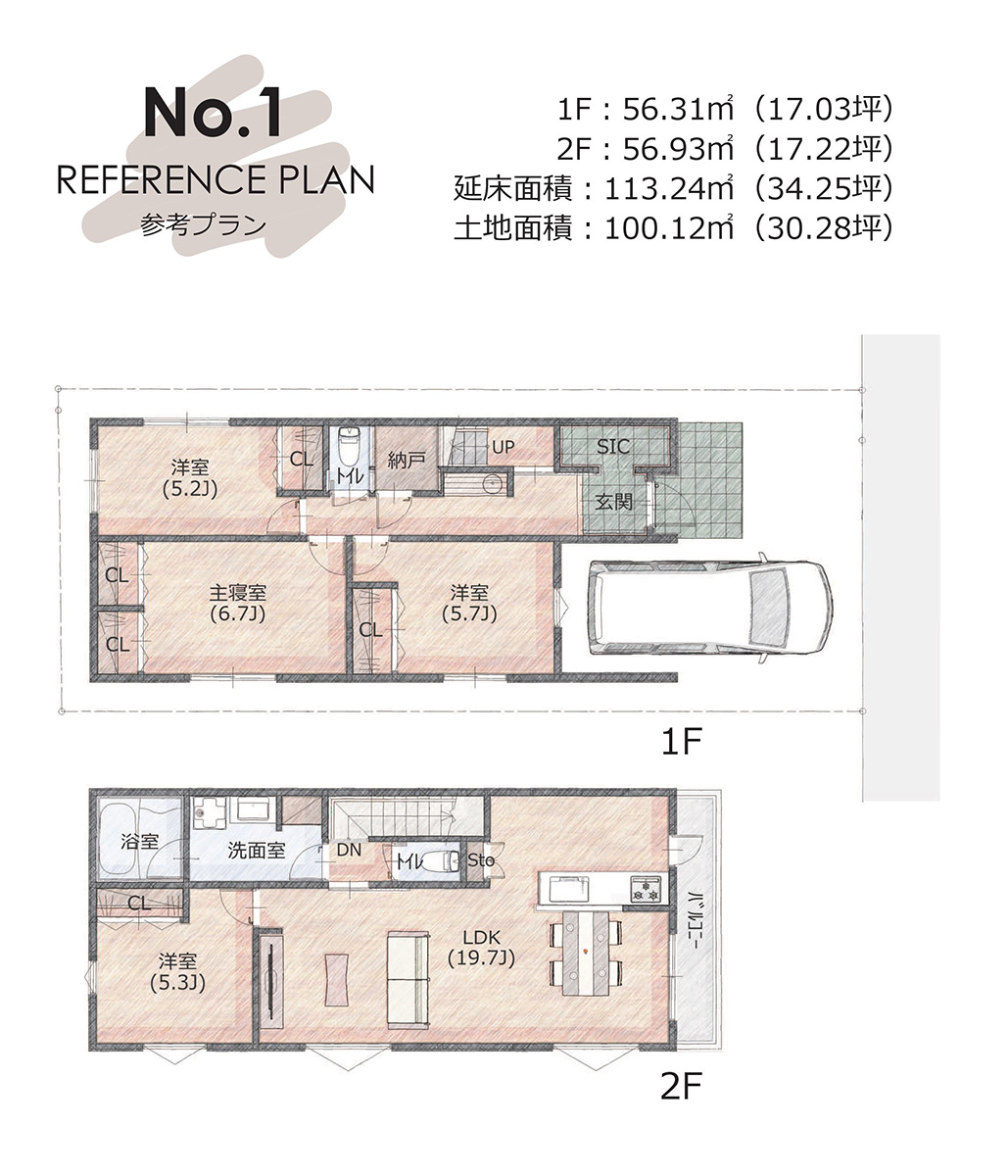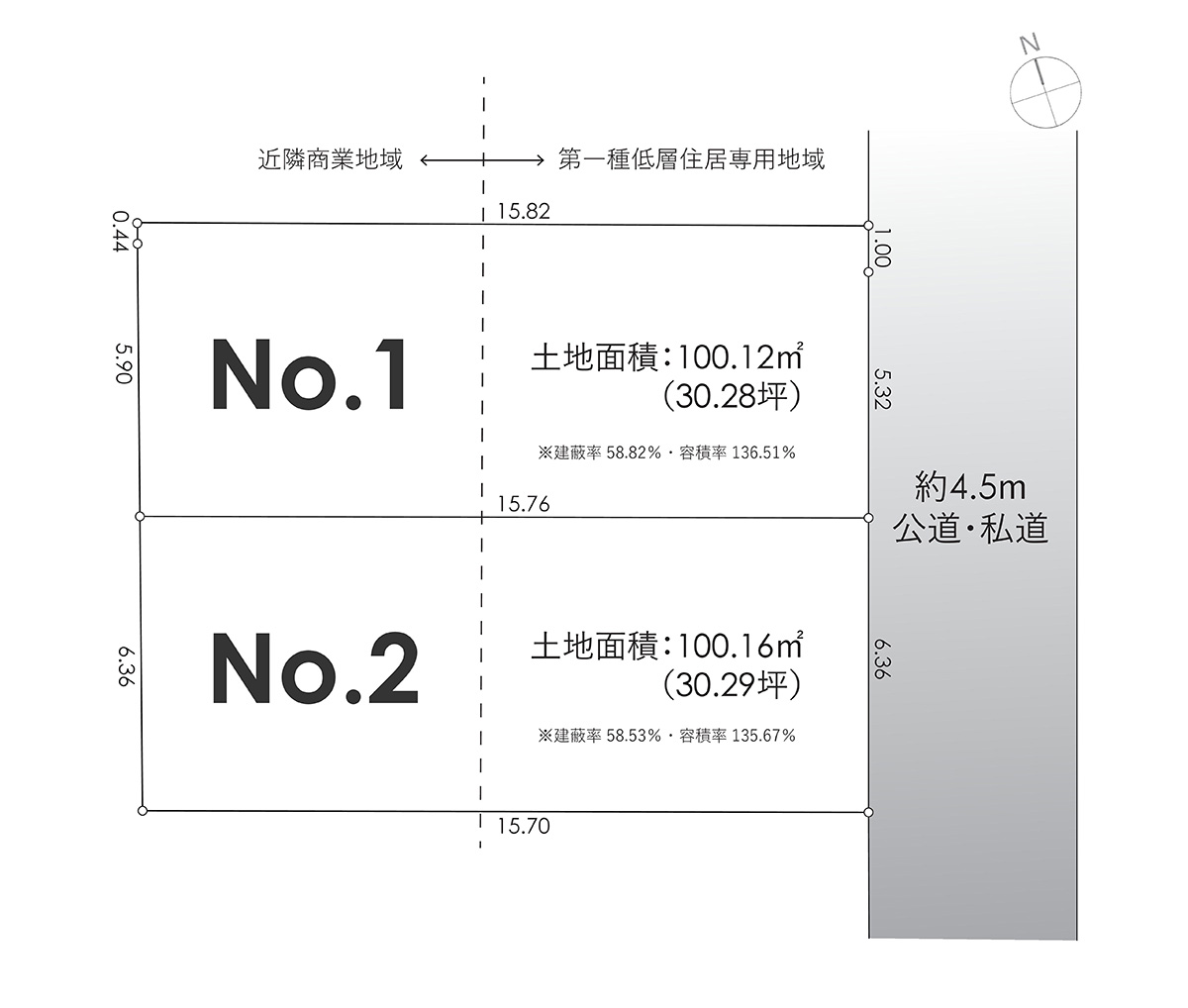 | 土地面積 | No.1:100.12㎡(30.28坪)※別途私道持分あり・No.2:100.16㎡(30.30坪)※別途私道持分あり | ||