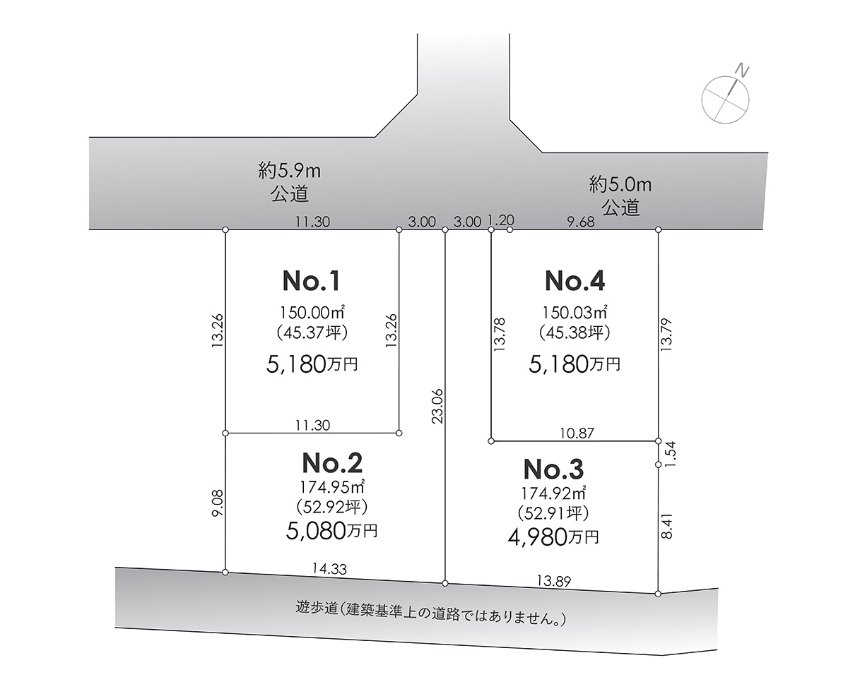 土地面積 No.1:150.00㎡(45.37坪)・No.2:174.95㎡(52.92坪)・No.3:174.92㎡(52.91坪)・No.4:150.03㎡(45.38坪)