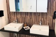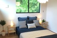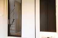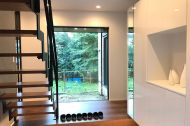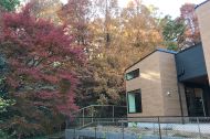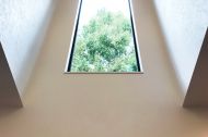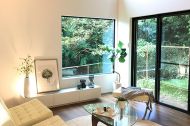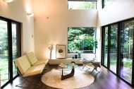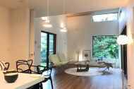 広々としたエントランスに入ると目前に広がる白山北緑地。森に包まれるように建つ1棟は屋内のいろいろな場所で自然を享受することができる。緑を全面に感じる窓、緑の先に青空が見える窓など窓の設置位置にもこだわりました。LDK前にはウッドデッキがあるので外へ出てお茶や読書をしたり、何もせずごろんと寝転がったりするのも贅沢な時間かもしれません。